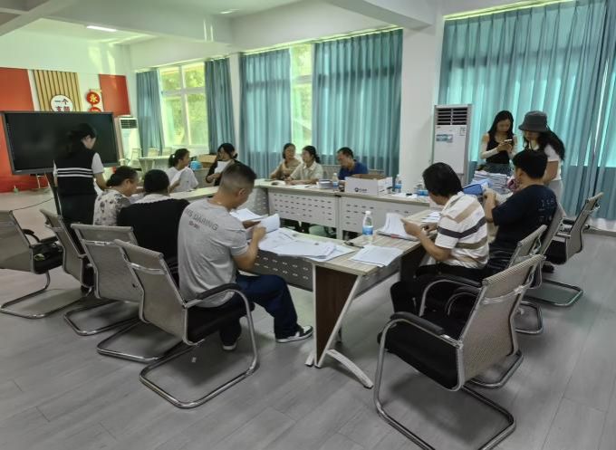 图为语文卓越教师班选拔面试、打分、手工艺品展示