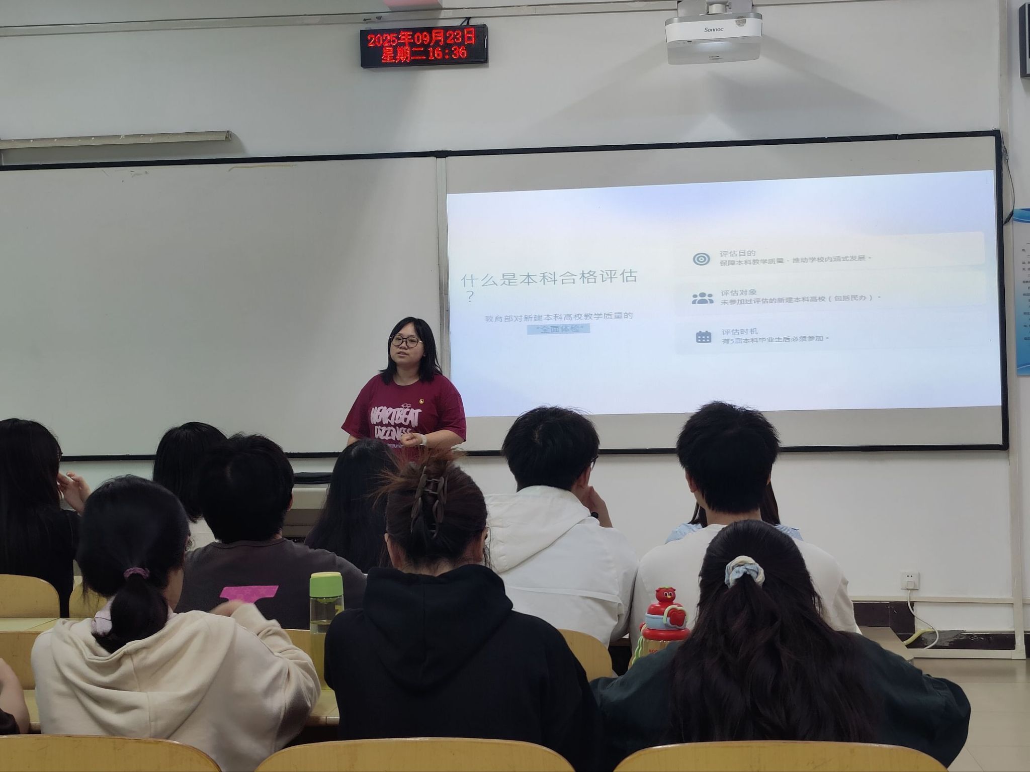 【本网讯】2025年9月23日,2023级汉语言文学初中语文卓越教师班团支部在合川A校区6教6305教室开展“评估同心,育人同行”主题团组织生活。活动通过齐唱团歌、知识问答、互动游戏等环节,助力支部成员掌握本科合格评估知识,为学校本科合格评估凝聚青春力量。