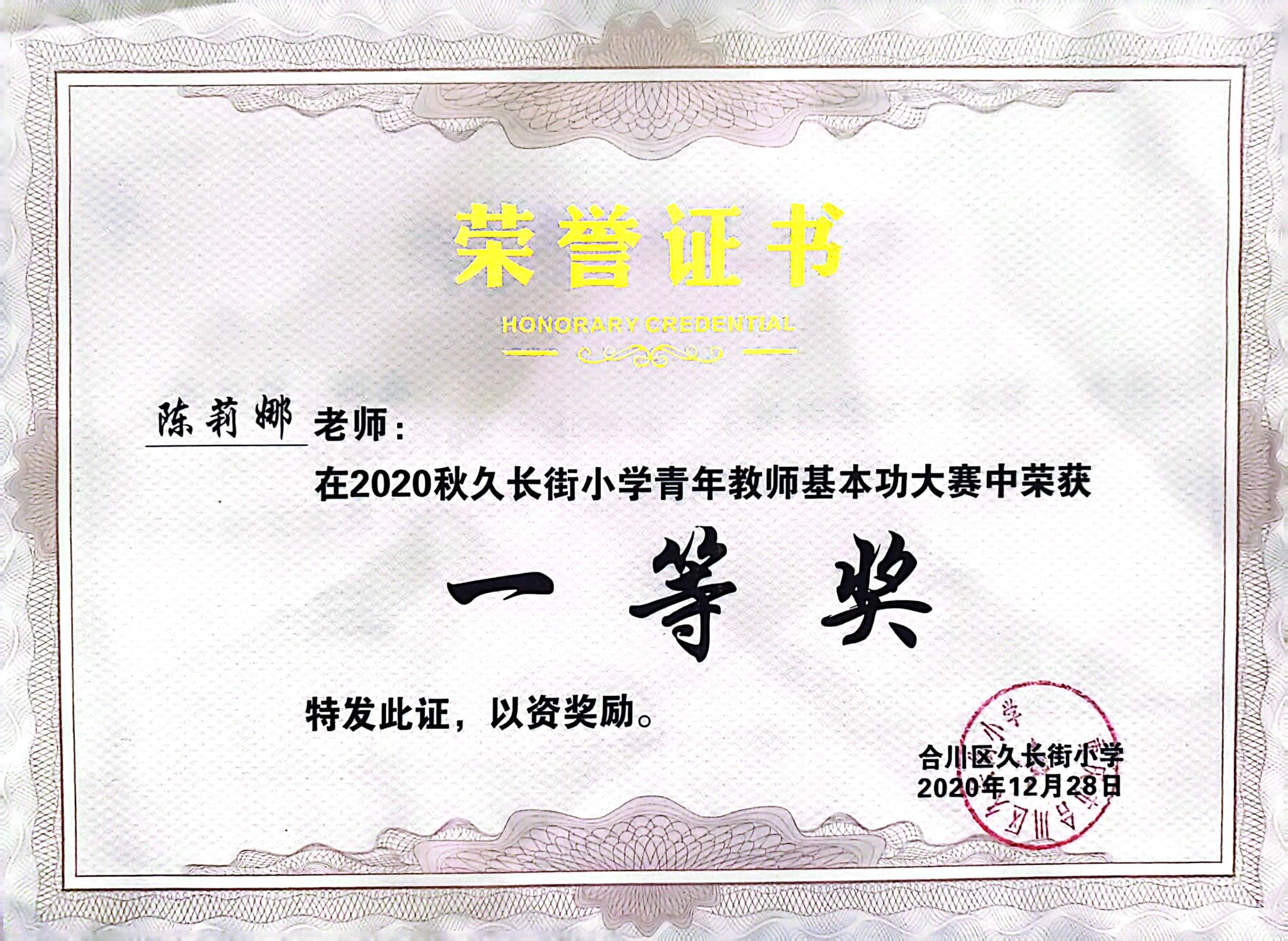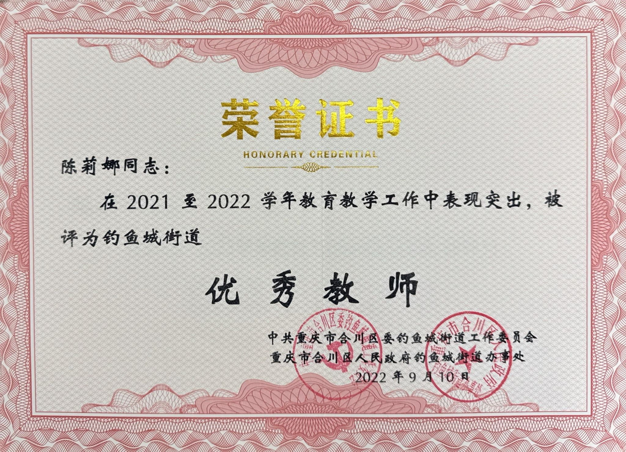 获重庆市第十届中小学班主任基本功竞赛小学组全能二等奖、主题班会活动二等奖;合川区"四心向党"中小学班主任基本功竞赛综合类一等奖等区级奖项9项、校级奖项3项。获重庆市第十四届、十五届基础教育课程改革征文大赛三等奖、二等奖。